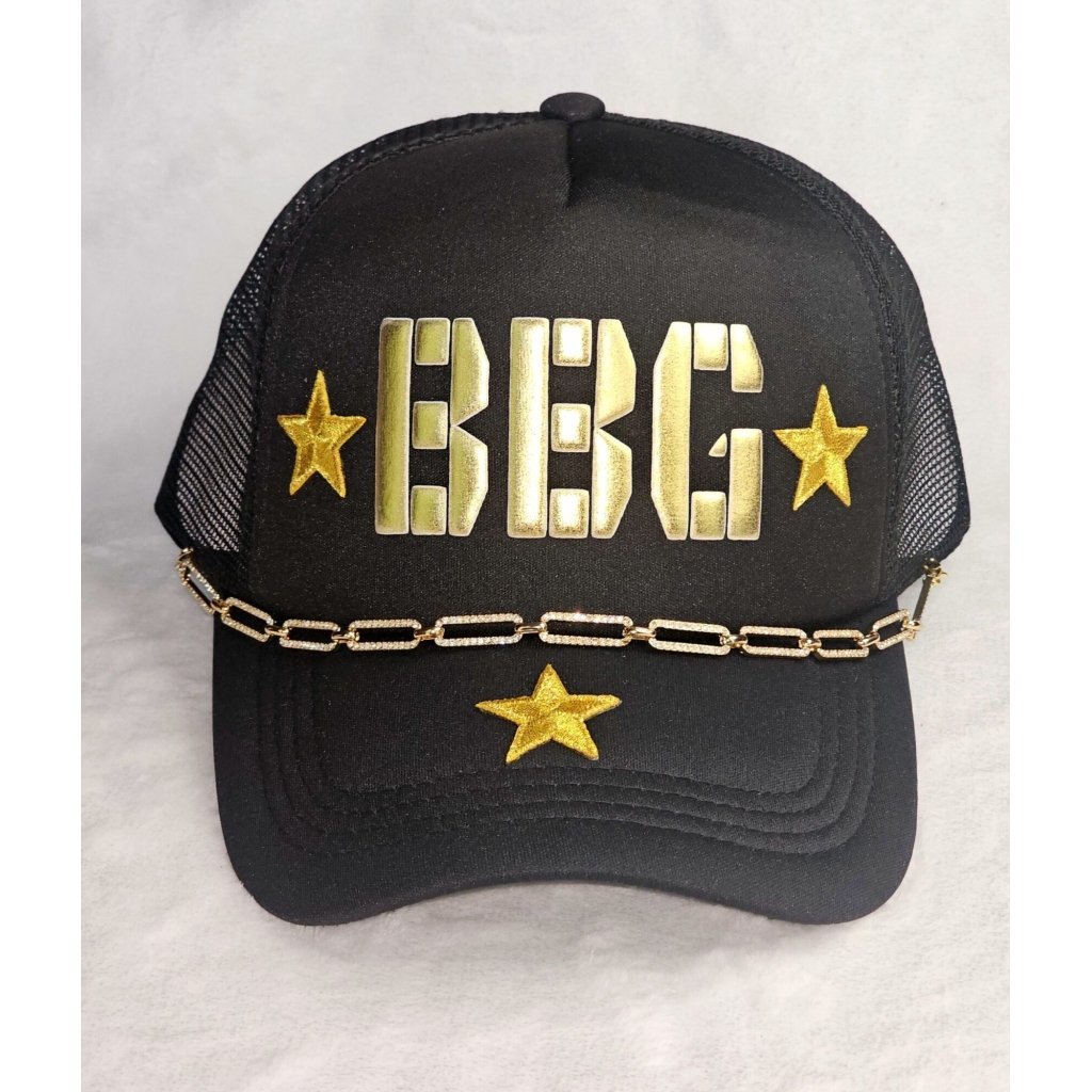 Stand out from the crowd with our BBG Black Trucker Hat Gold Star Edition. This iconic military style cap boasts urban edge with luxurious flair, featuring a sleek black design accented by a striking gold chain accessory. Crafted for both comfort and style, it’s the perfect accessory to complete any casual ensemble. Add a touch of sophistication to your look with the BBG Black Trucker Hat Gold Star Edition.