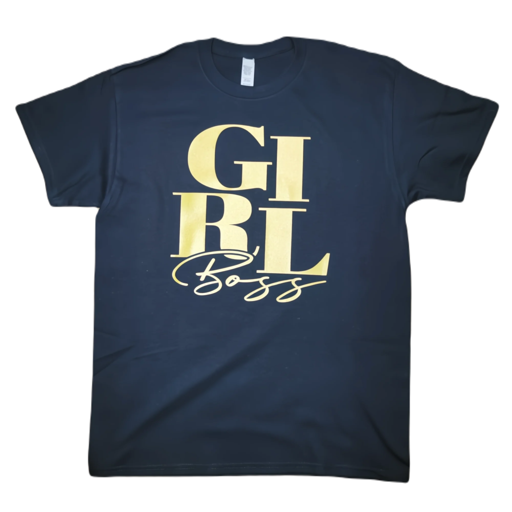 Imagine this: You Walk into the room, wearing this black t-shirt with bold, gold metallic lettering that reads “Boss Girl.” The simplicity of your attire displays the power you exhibit. There’s nothing subtle about your presence; you own the space with an aura of confidence and determination. Your attire speaks volumes about your attitude – bold, unapologetic, and ready to conquer any challenge that comes your way. With a subtle nod and a gleam in your eye, you’re ready to take charge and show the world what a true boss looks like.