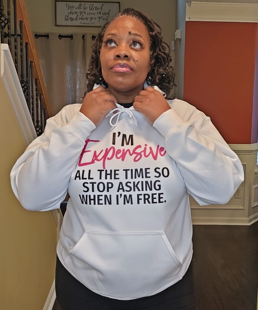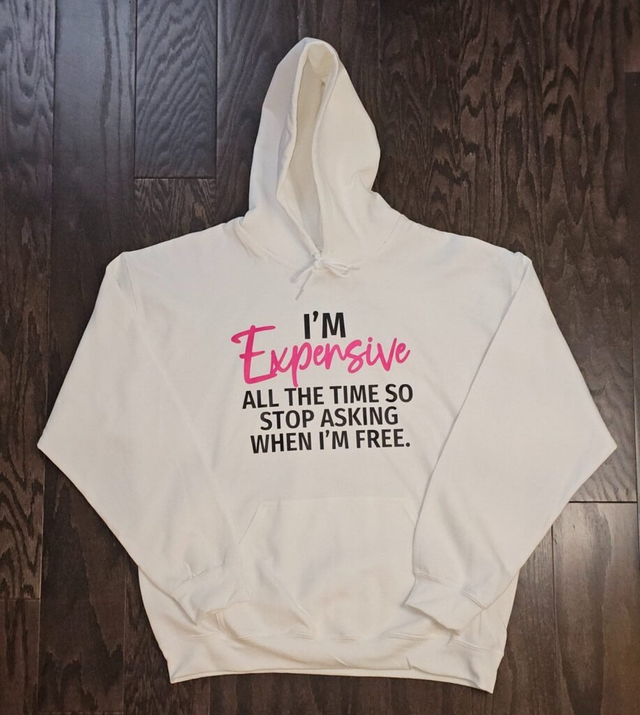 Let them know your worth with this standout white hoodie, declaring “I’m Expensive All the Time, Stop Asking When I’m Free.” Featuring “Expensive” in bold pink lettering, this hoodie brings a splash of attitude and style. Made for those who embrace their value, it’s the perfect blend of comfort and unapologetic confidence—because confidence never goes out of style.