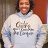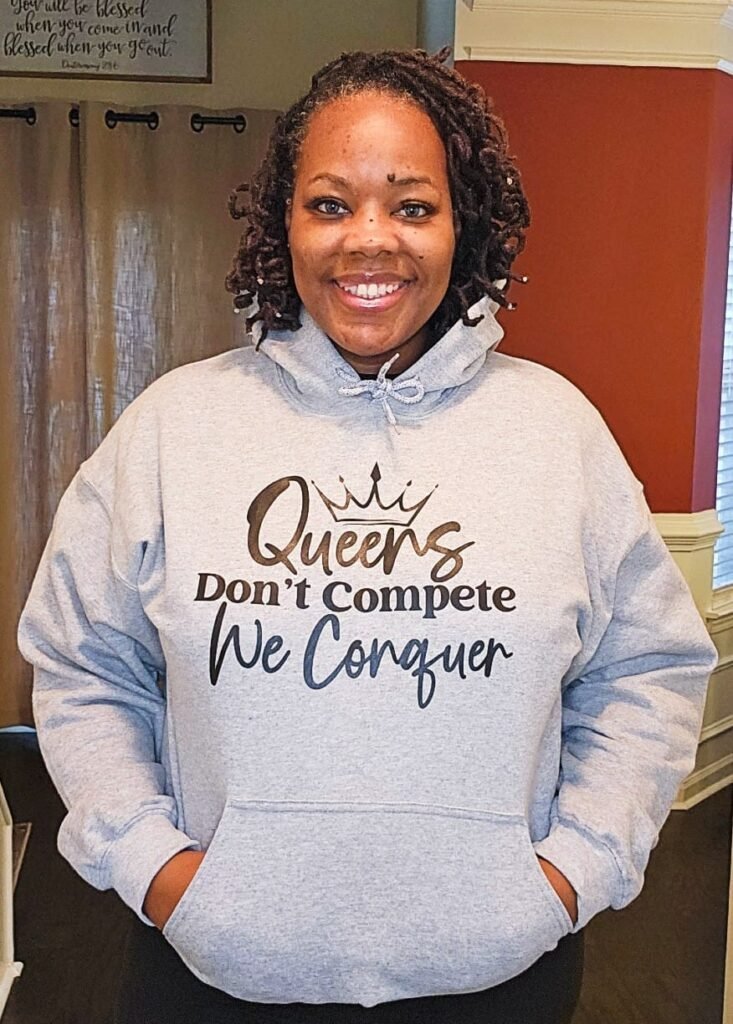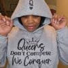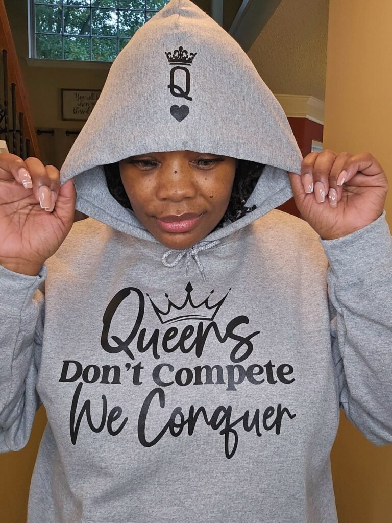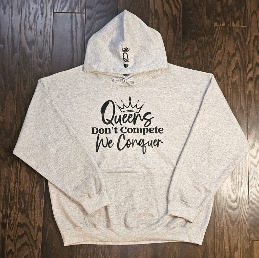 Command attention with this sleek standout grey hoodie that speaks to the strength and confidence of every queen. Featuring the empowering phrase “Queens Don’t Compete, We Conquer,” this hoodie is made for those who know their worth. The hood is adorned with a unique Queen of Hearts-inspired “Q” topped with a crown, adding a subtle but powerful reminder of your royal vibe. Perfect for bold queens ready to conquer their day in both comfort and style.