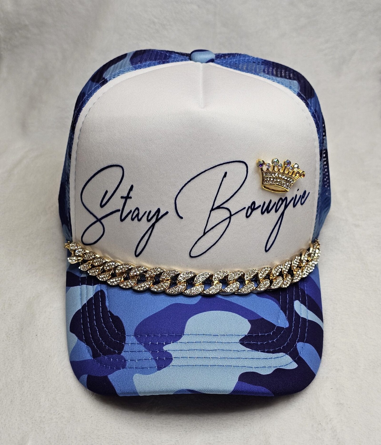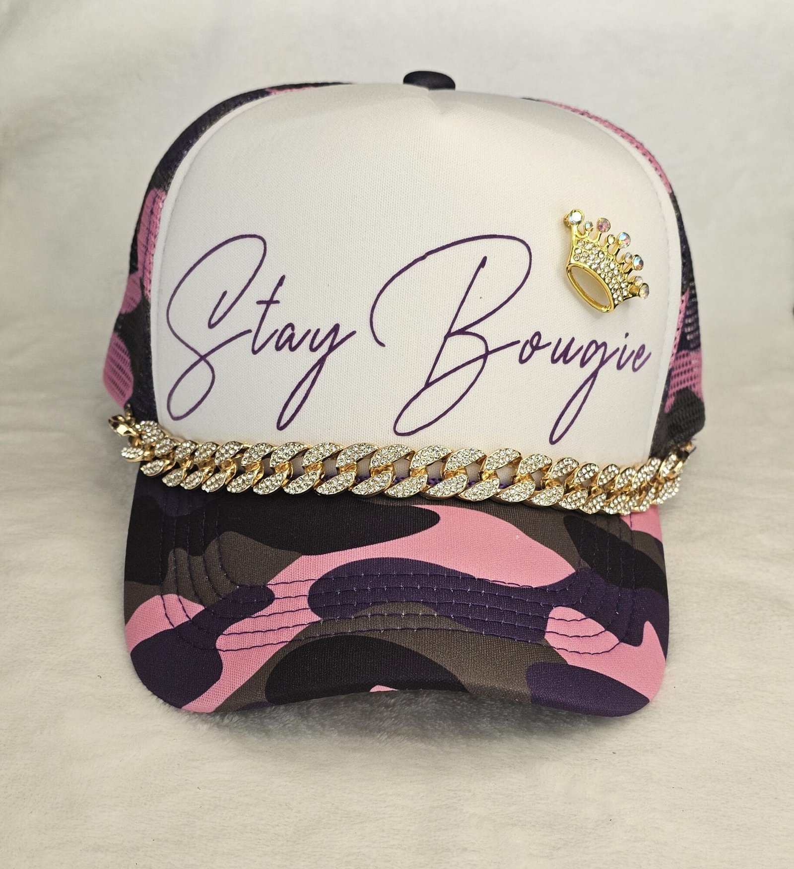 The Stay Bougie Trucker Hat is a trendy accessory available in either a vibrant pink or blue camo pattern. This stylish hat combines urban style with a touch of elegance, perfect for making a bold fashion statement. It boasts a comfortable mesh back for breathability and an adjustable snapback closure for a customized fit. The front panel is adorned with the “Stay Bougie” logo in eye-catching lettering, accentuated by a luxurious gold chain along the brim and a gold crown brooch for added flair. Ideal for both casual outings and stylish streetwear ensembles, this trucker hat effortlessly merges comfort with a chic, bougie vibe.